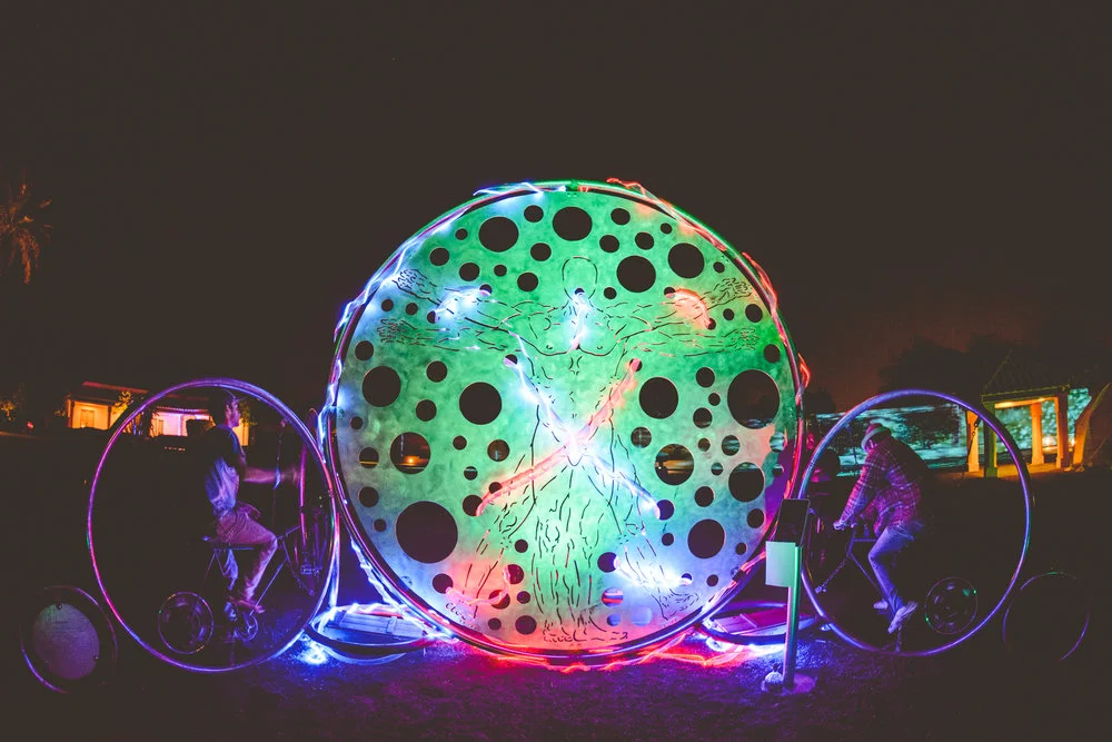 This participatory metal sculpture is about microplastic pollution that flows from our seas into us. There are four bicycle generators that power LED lights and water pumps that push microplastic-laden water through the body of DaVinci’s Vitruvian Man.